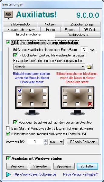 - Wird sie in eine andere, sonst aber ebenfalls frei definierbare Bildschirmecke gestellt, so wird der Bildschirmschoner blockiert, d.h. er startet auch dann nicht, wenn die eingestellte Wartezeit abgelaufen ist.