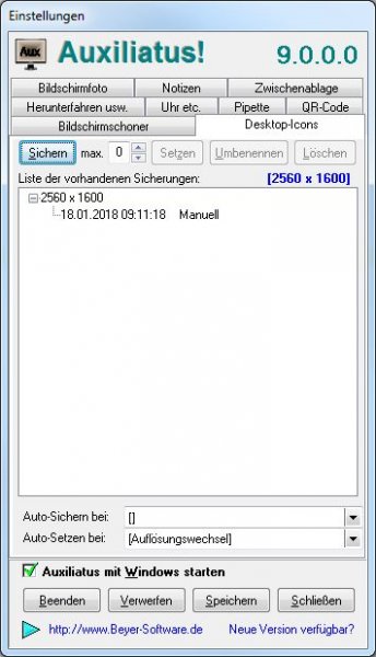 Dabei werden die Positionen Bildschirmweise verwaltet, also auch bei Verschiebungen der Positionen der Zusatzmonitore sowie bei Änderung des Hauptbildschirms wieder richtig zugeordnet! Nur das Herausnehmen, Austauschen oder Hinzufügen eines kompletten Monitors macht die gespeicherten Positionen u.U. ungültig bzw. führt wahrscheinlich zu einem nicht korrekten Setzen der Positionen. - Die Iconpositionen jeder dieser Sicherungen können manuell oder (die neueste) optional auch automatisch bei bestimmten Ereignissen wie beim Start von Auxiliatus oder nach jedem Auflösungswechsel wiederhergestellt werden.