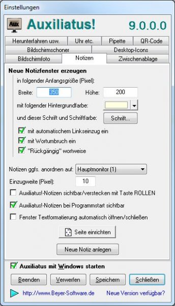 - Erzeugung, Anzeige und Verwaltung von Notizfenstern (über das Kontextmenü des Tray-Icons von Auxiliatus! bzw. eine Registerseite im Options-Dialog).