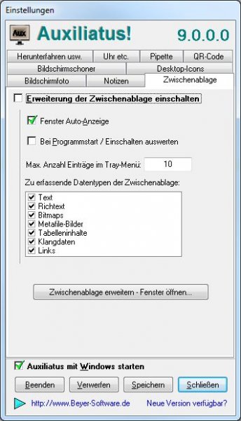 - Auf einer Registerseite "Zwischenablage" im Einstellungen-Dialog können diverse Vor- und Grundeinstellungen für die Funktion selbst und die Verwaltung etc. vorgenommen werden.