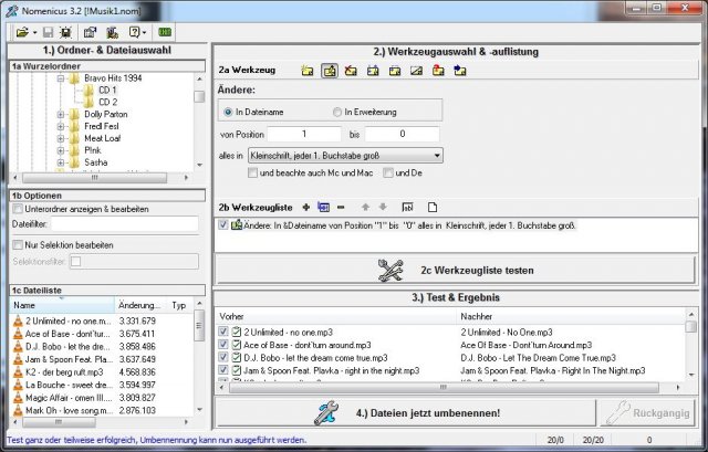 - Immer zuerst testweise Anwendung aller Werkzeuge auf die Dateiauswahl, dabei direkte Anzeige des jeweiligen Ergebnisses für jede Datei in einer Ergebnisliste, evtl. Fehlerhinweise und Ausschluß aller problematischen Dateien von der Umbennennung.